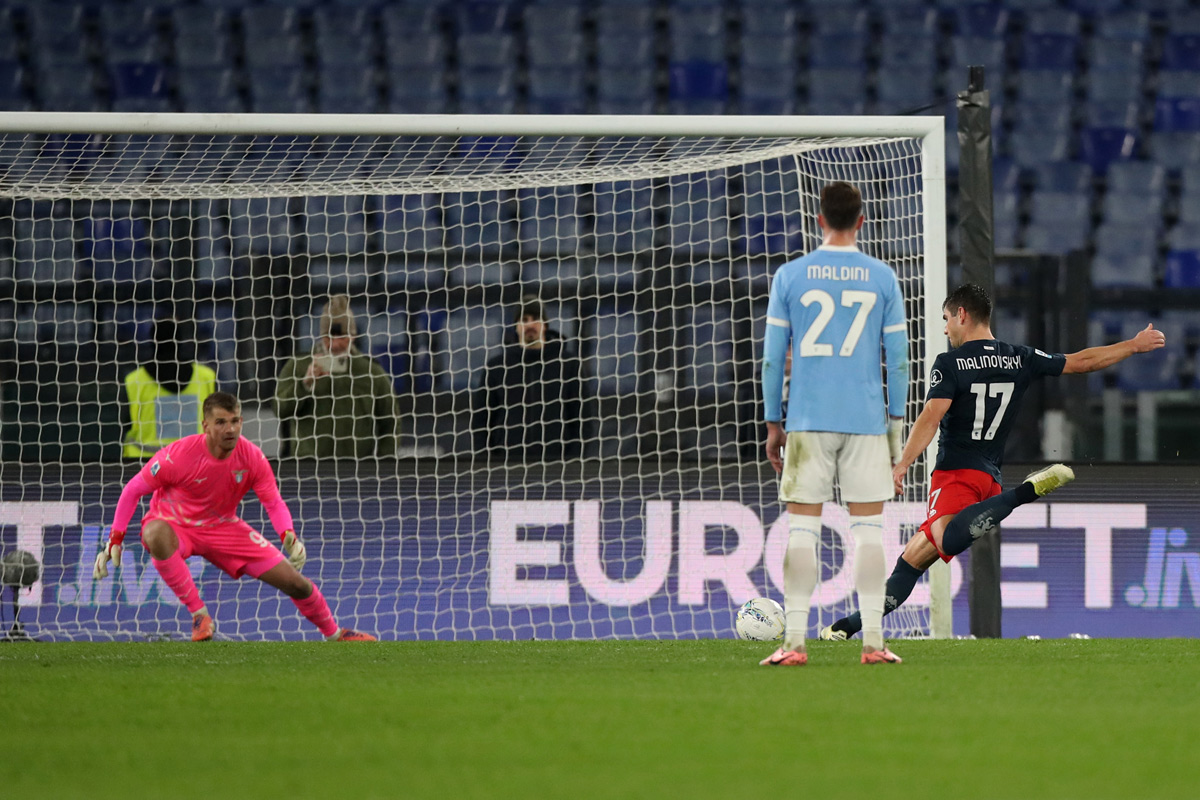 Руслан Малиновський відправляє м’яч у ворота «Лаціо»32-річний українець реалізував пенальті у вчорашньому матчі чемпіонату Італії проти «Лаціо».