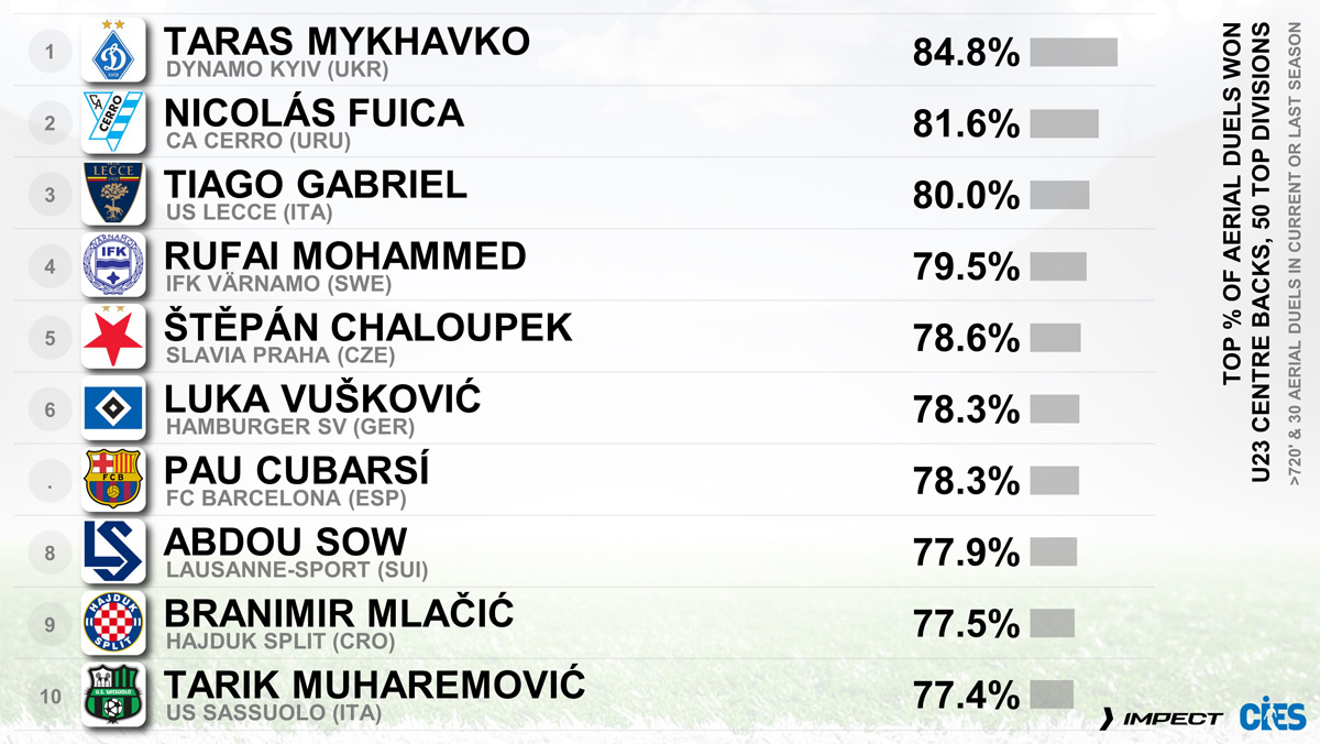 Міжнародний центр спортивних досліджень (CIES) опублікував свою версію рейтингу центральних захисників віком до 23 років з 50 провідних національних чемпіонатів за показником виграних єдиноборств.