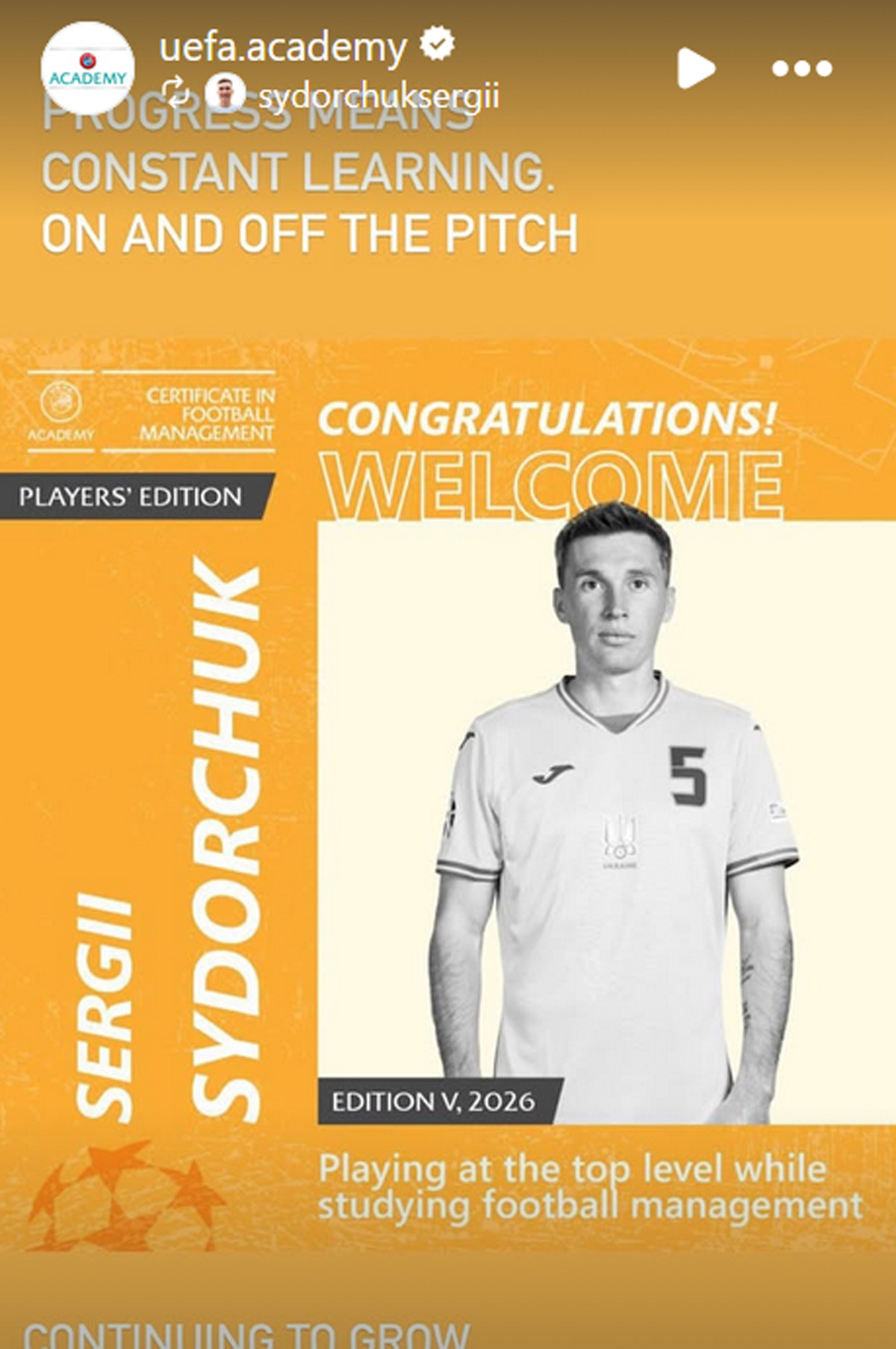 «Прогрес означає постійне навчання. На полі та за його межами. Продовжуємо рости разом з академією УЄФА», — так Сидорчук прокоментував своє рішення навчатися в академії УЄФА.