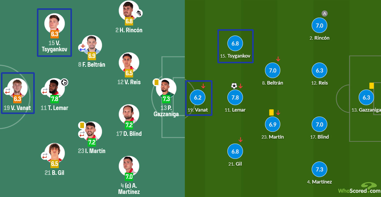 SofaScore поставив обом українцям за цей матч по 6.3 бала, що стало найнижчою оцінкою серед гравців стартового складу «Жирони». У випадку ж з WhoScored у Ваната також найнижча оцінка в «основі» каталонської команди — 6.2 бала, а у Циганкова 6.8 бала — це третій знизу показник.