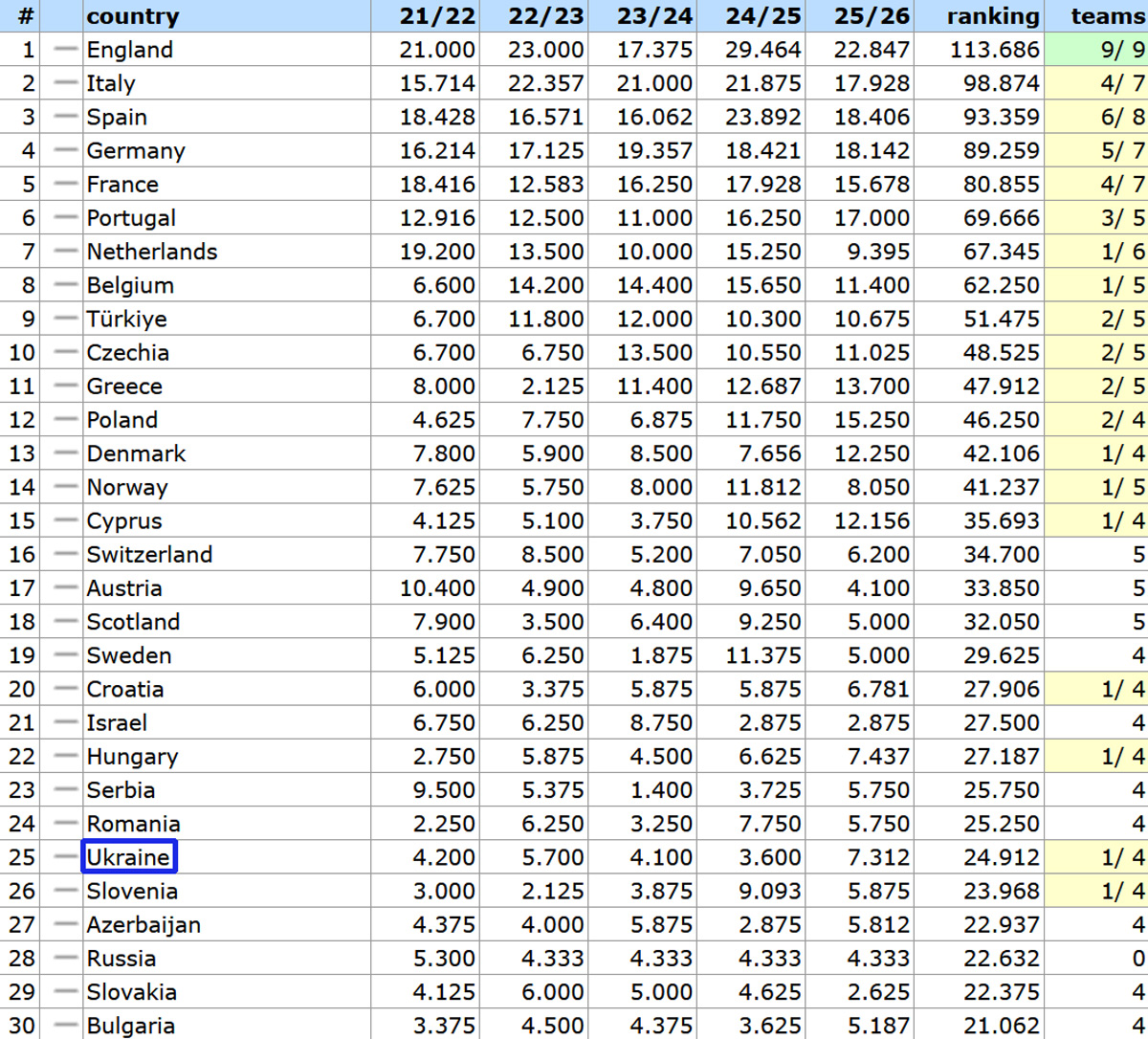 Нагадаємо, що підсумкова таблиця коефіцієнтів УЄФА у нинішньому сезоні визначатиме представництво країн в єврокубках сезону-2027/28.