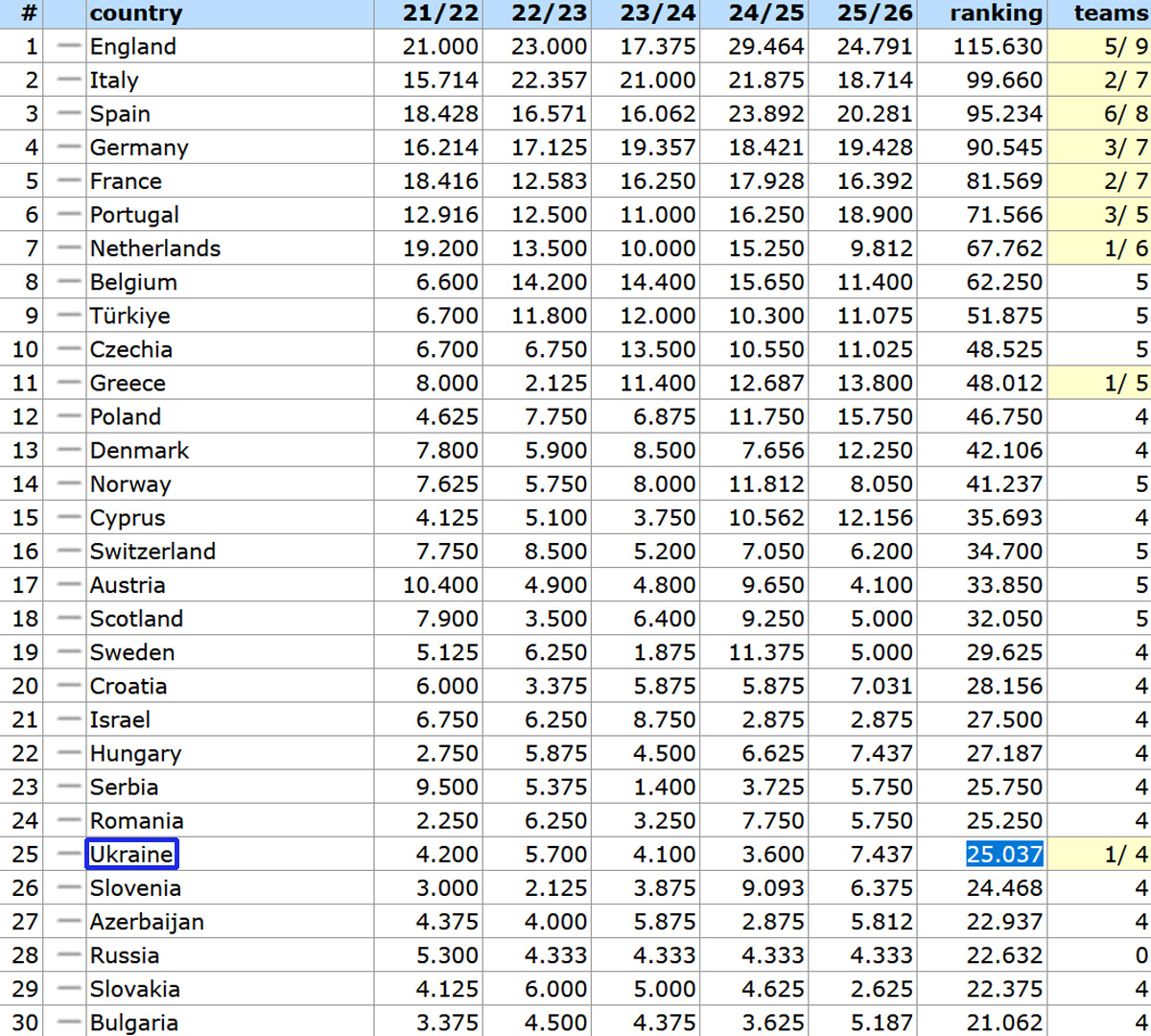 Нагадаємо, що підсумкова таблиця коефіцієнтів УЄФА в нинішньому сезоні визначатиме представництво країн у єврокубках сезону-2027/28.