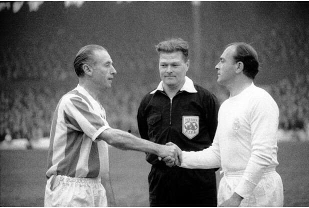 На цьому фото зображені легенди світового футболу, володарі "Золотого м'яча" різних років Стенлі Метьюз і Альфредо ді Стефано перед початком міжнародного товариського матчу "Сток Сіті" — "Реал" (Мадрид). До речі, обидві команди того року були чинними чемпіонами своїх країн.